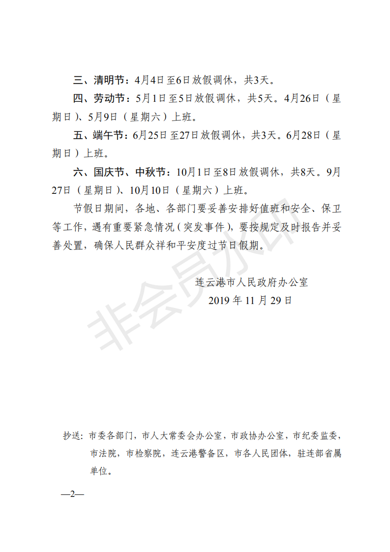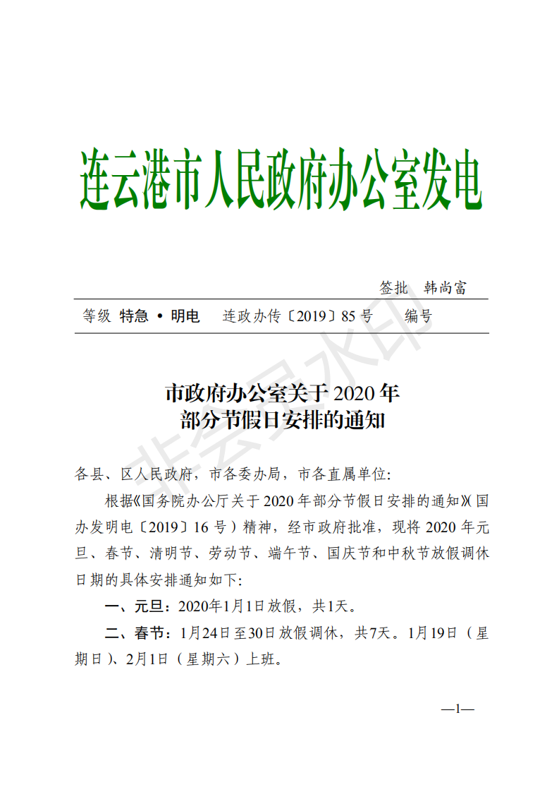 市政府辦公室關于2020年部分節假日安排的通知