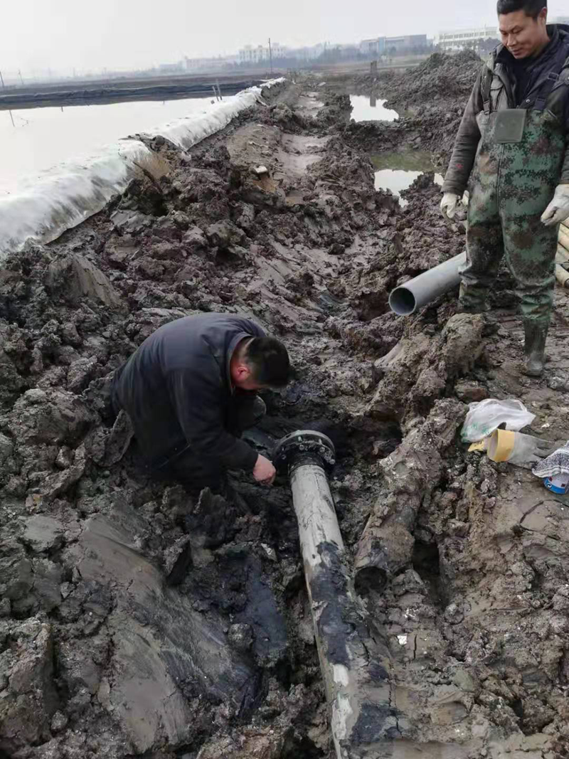 該項工程是為了配合開發(fā)區(qū)新建道路正常施工,和保證大浦工區(qū)原鹽生產(chǎn)不受影響,由翔立分公司承接的猴嘴十二路下穿DN315和DN160兩根PE管道穿越工程。因規(guī)劃的穿越點處于水塘邊,現(xiàn)場施工環(huán)境較為困難。翔立公司參與施工人員想方設(shè)法克服困難,穿越施工前采取發(fā)電機水泵抽排水、填土夯實頂管機作業(yè)場地、克服淤泥深等障礙,保證施工進度的正常進行。