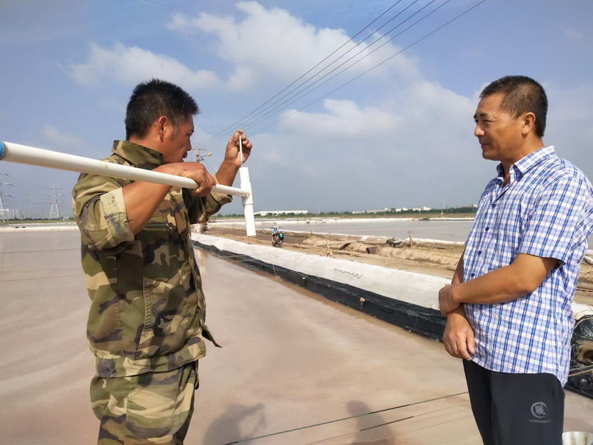 上圖為礦鹽生產顧問王緒前在現場指導測量鹵水波美度及相關數據